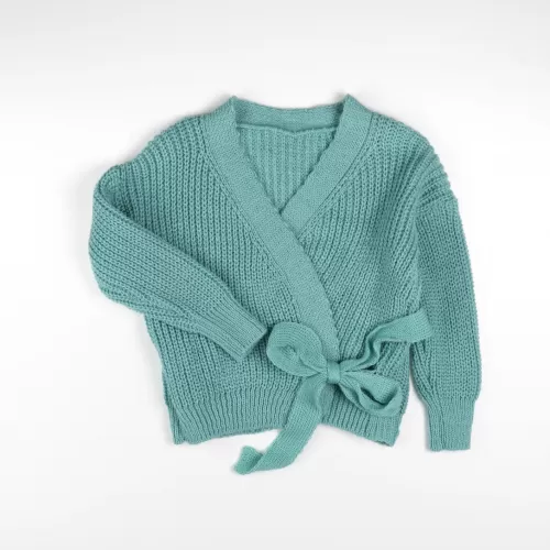 TIRKIZNA PLETENA VESTA NA VEZANJE PREKLOP (Ž/4)